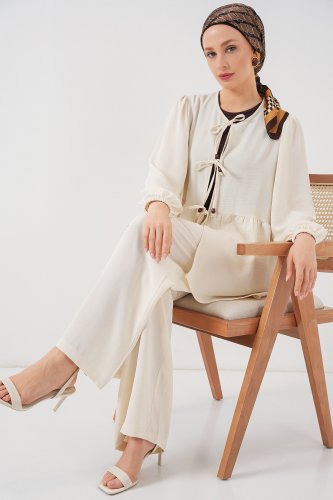 • Önü Bağcıklı Tunik Pantolon İkili Takım 6744 Ekru