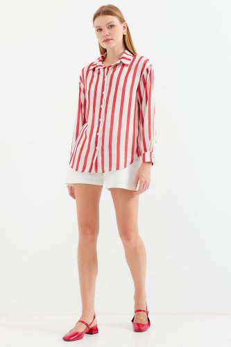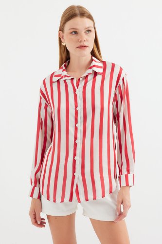• 3964 Hafif Dökümlü Saten Gömlek AKırmızı